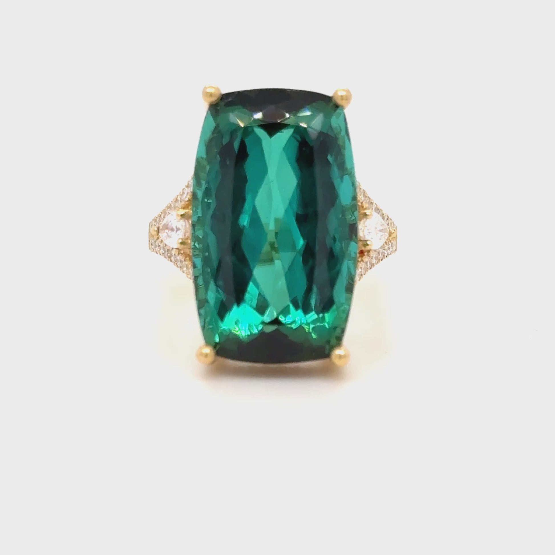 This striking green tourmaline and diamond ring is a bold expression of color and refined craftsmanship. Set in rich 18K yellow gold, the ring features a magnificent natural green tourmaline weighing approximately 17.55 carats, chosen for its vibrant hue and impressive presence.