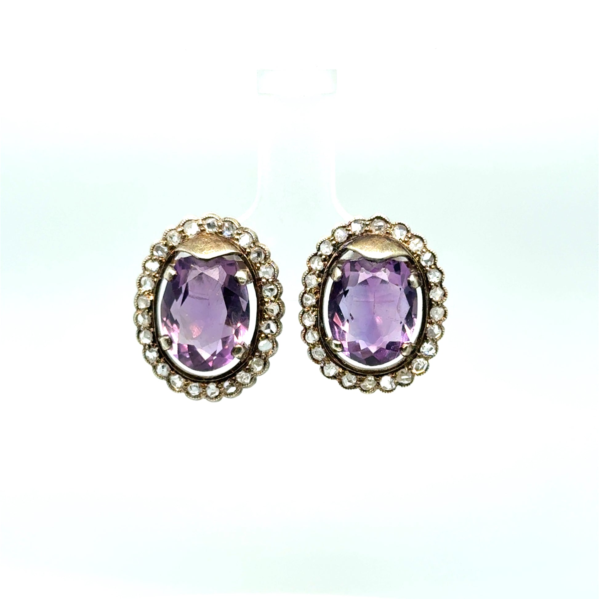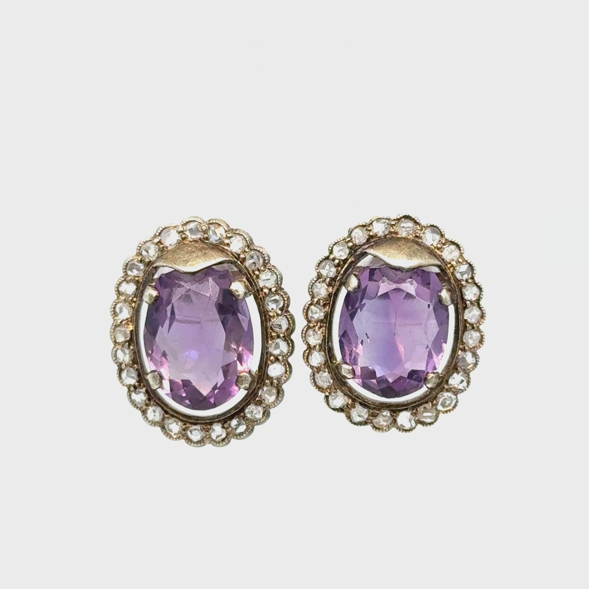 Radiating timeless beauty and graceful colour, this stunning pair of earrings features two vivid purple oval mixed-cut natural amethysts, weighing a total of 6.30 carats. Each amethyst is surrounded by a delicate halo of 49 rose cut natural diamonds, adding a soft, vintage-inspired sparkle that enhances the rich tones of the center stones.