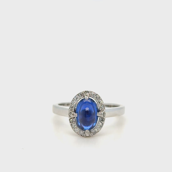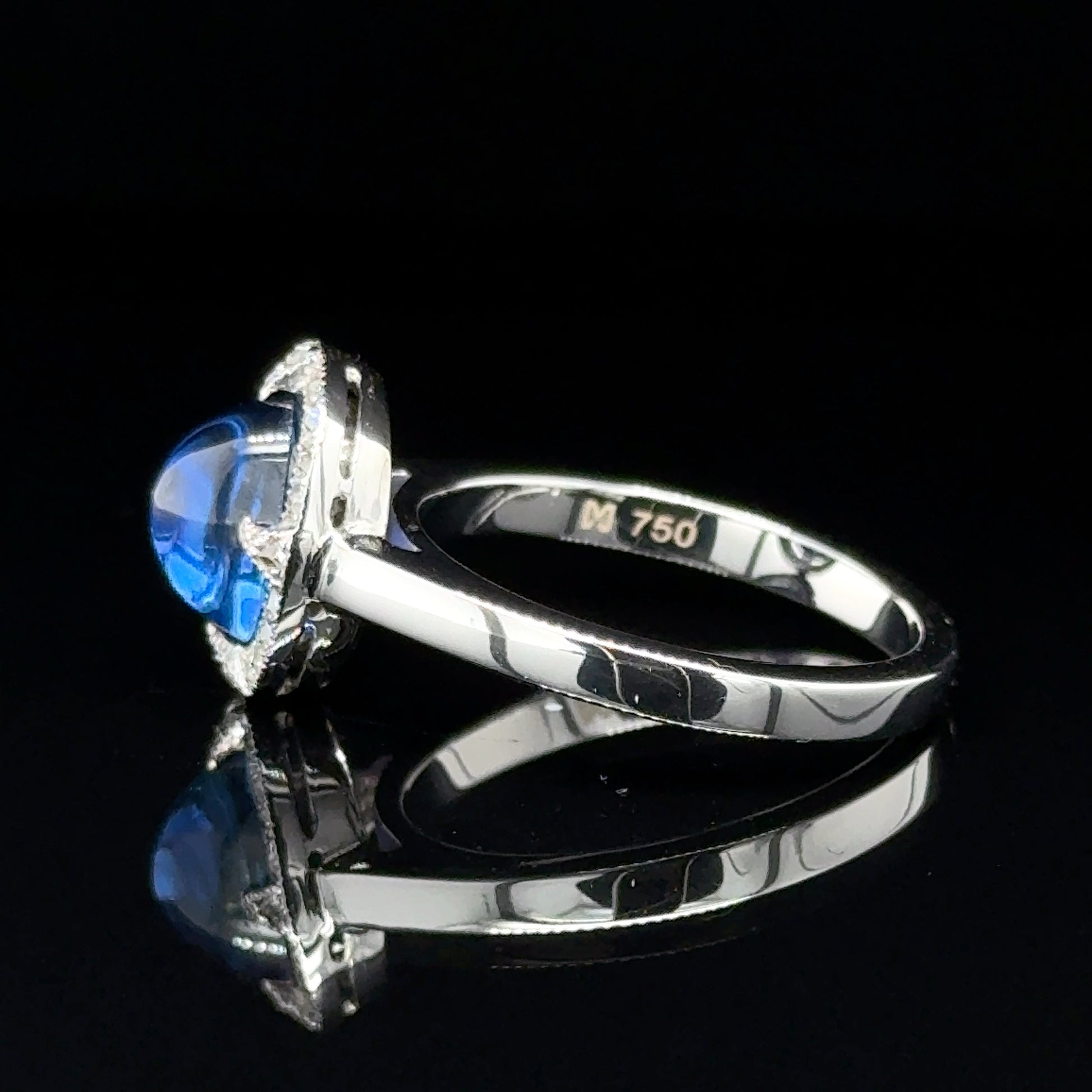 Ceylon Cabochon Sapphire & Antique Diamond Ring in 18K White Gold