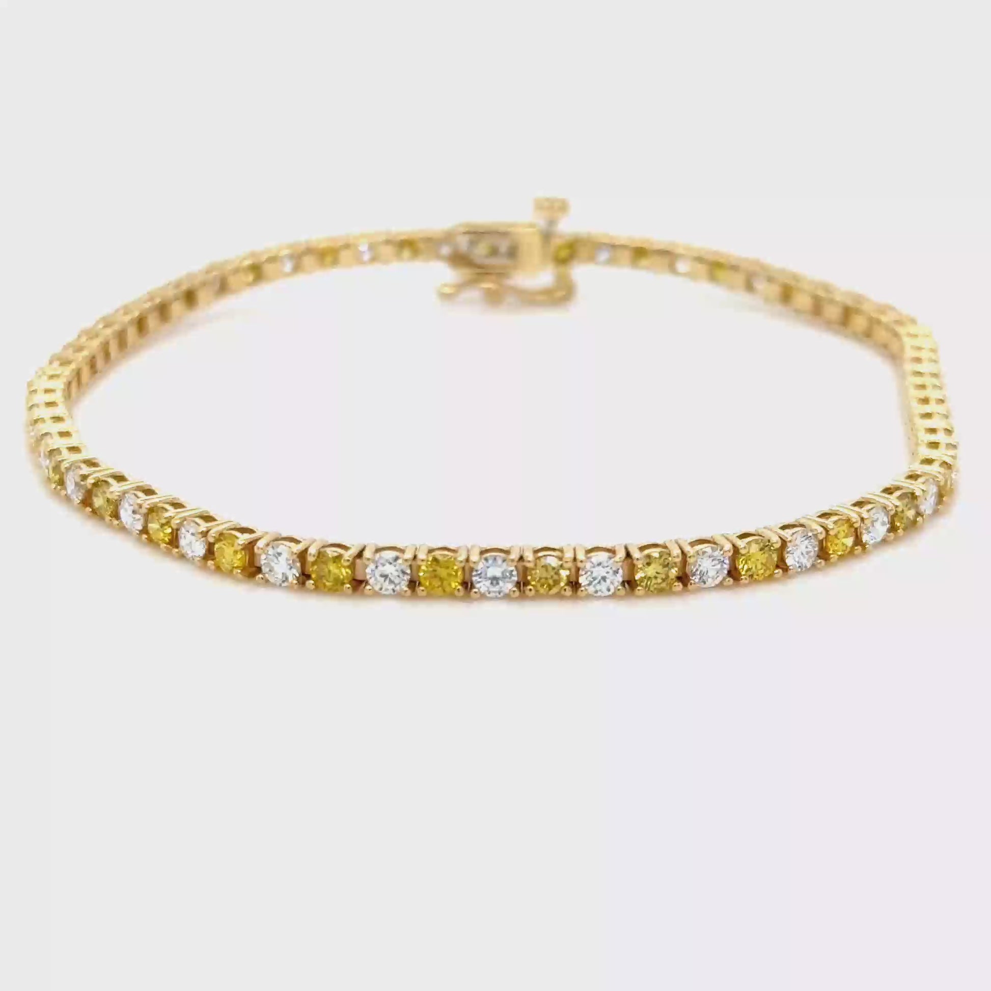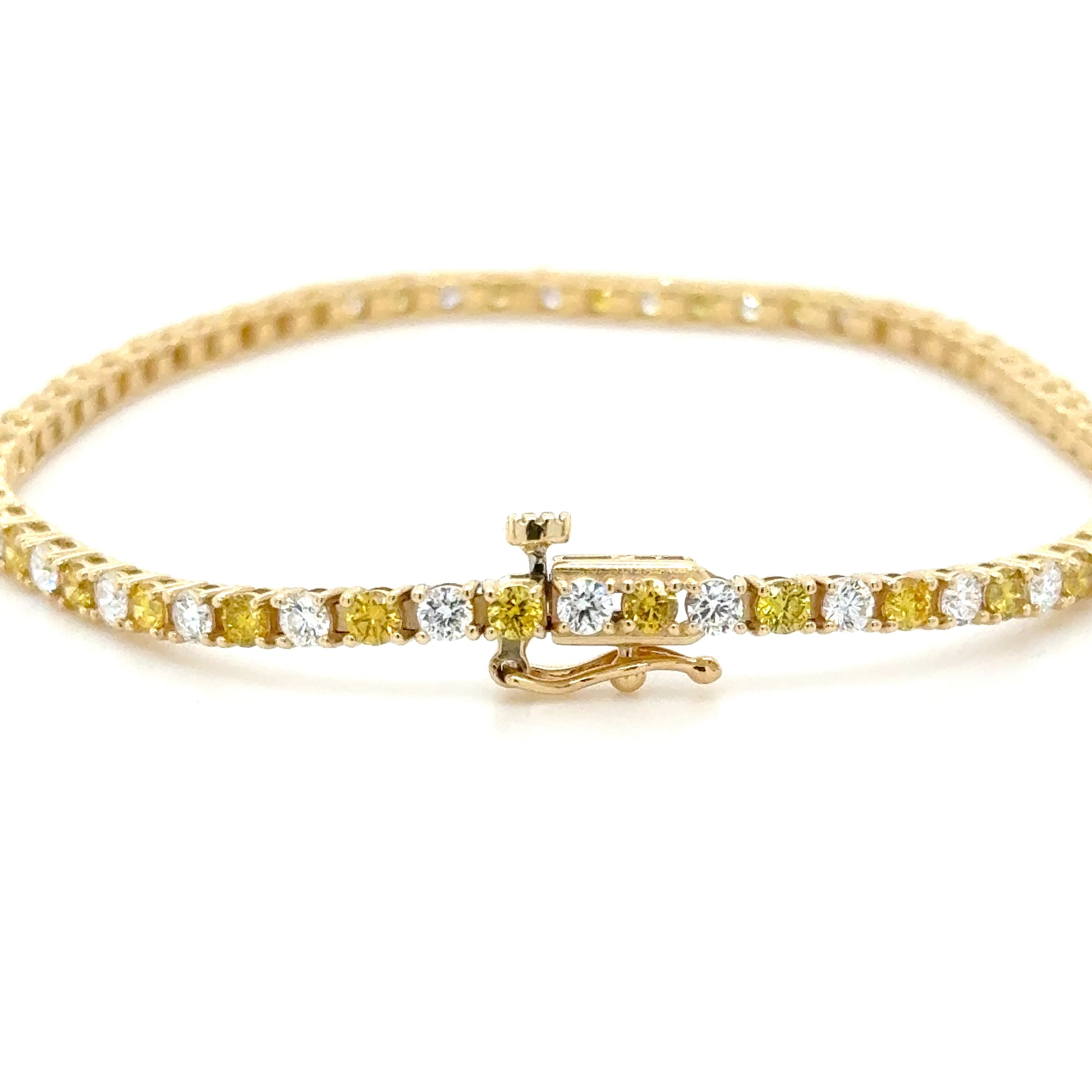 Timeless and radiant, this exquisite tennis bracelet is crafted in luxurious 18K yellow gold and adorned with a stunning combination of natural yellow and white diamonds totaling 3 carats. Designed to catch the light with every movement, it adds effortless elegance and brilliance to any ensemble.