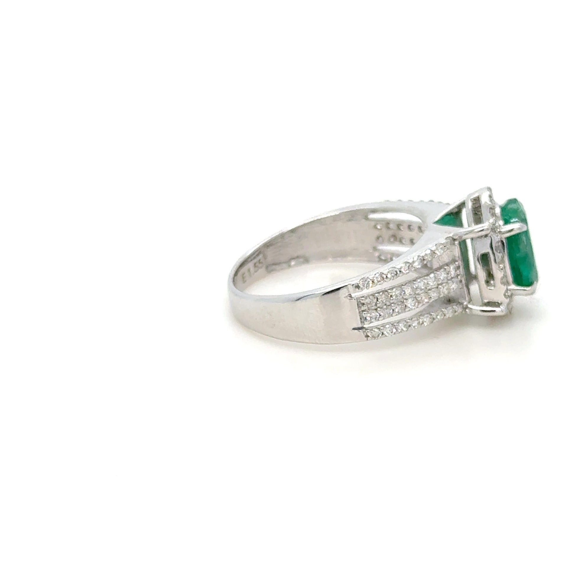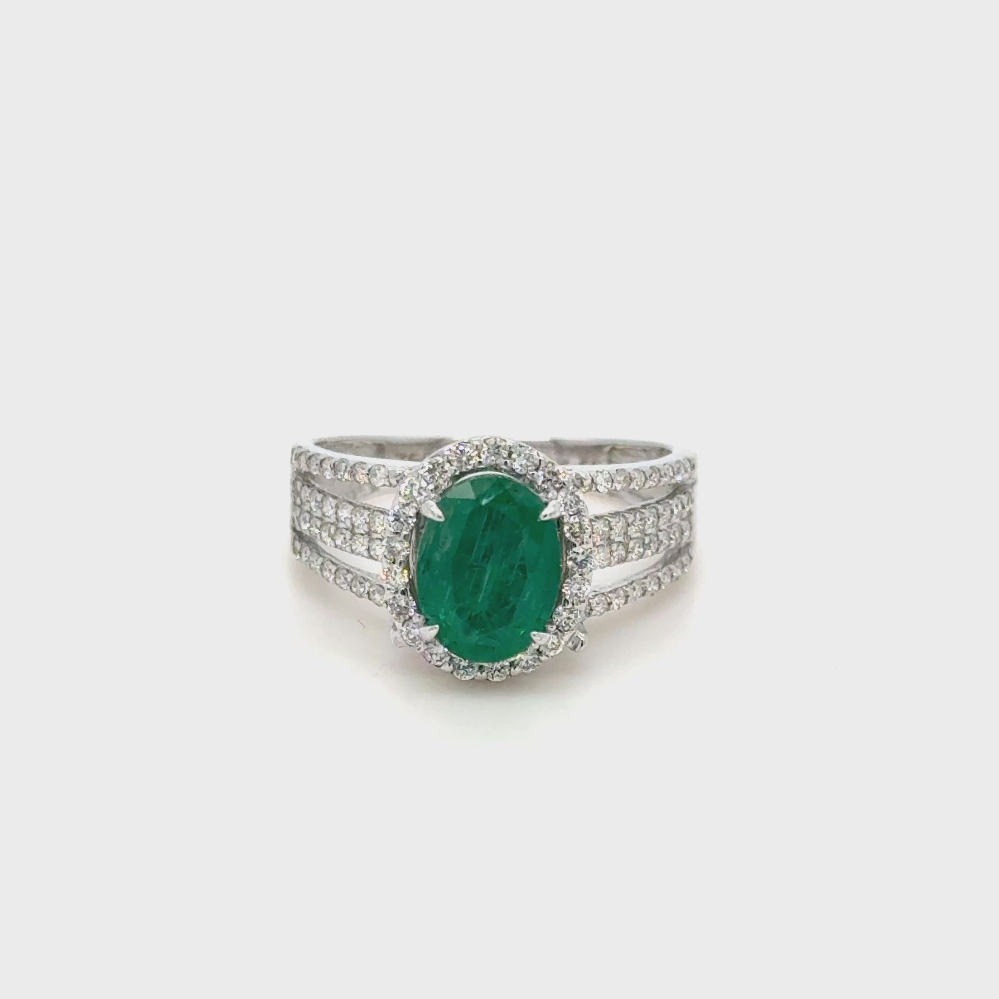 Timeless elegance meets vivid natural beauty in this exquisite emerald and diamond ring, crafted in luxurious 18K white gold. At its heart lies a vibrant 1.55 carat oval-cut Zambian emerald, prized for its deep, rich green hue and exceptional clarity. The central gemstone is gracefully framed by sparkling natural diamonds, enhancing its brilliance and adding a touch of classic sophistication.