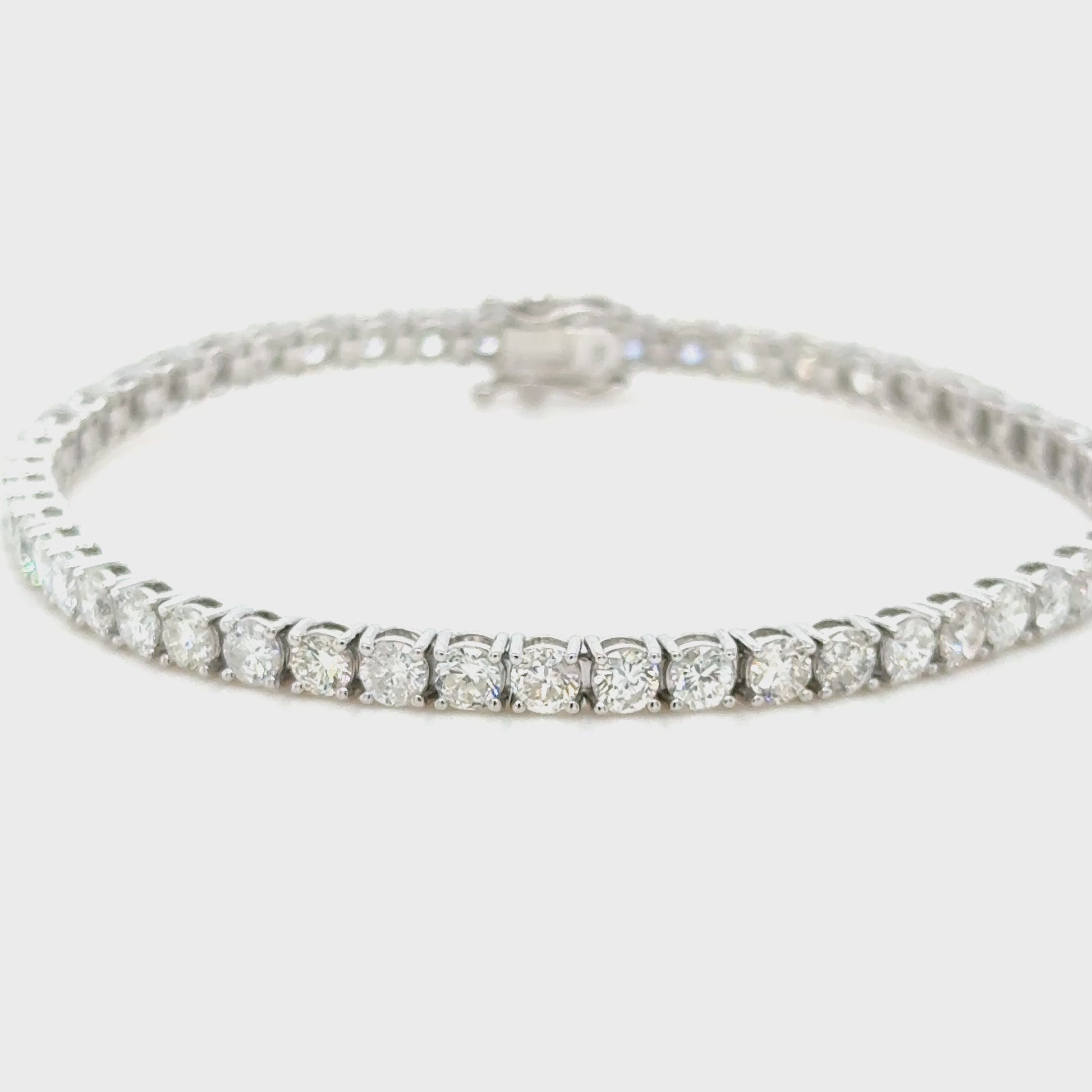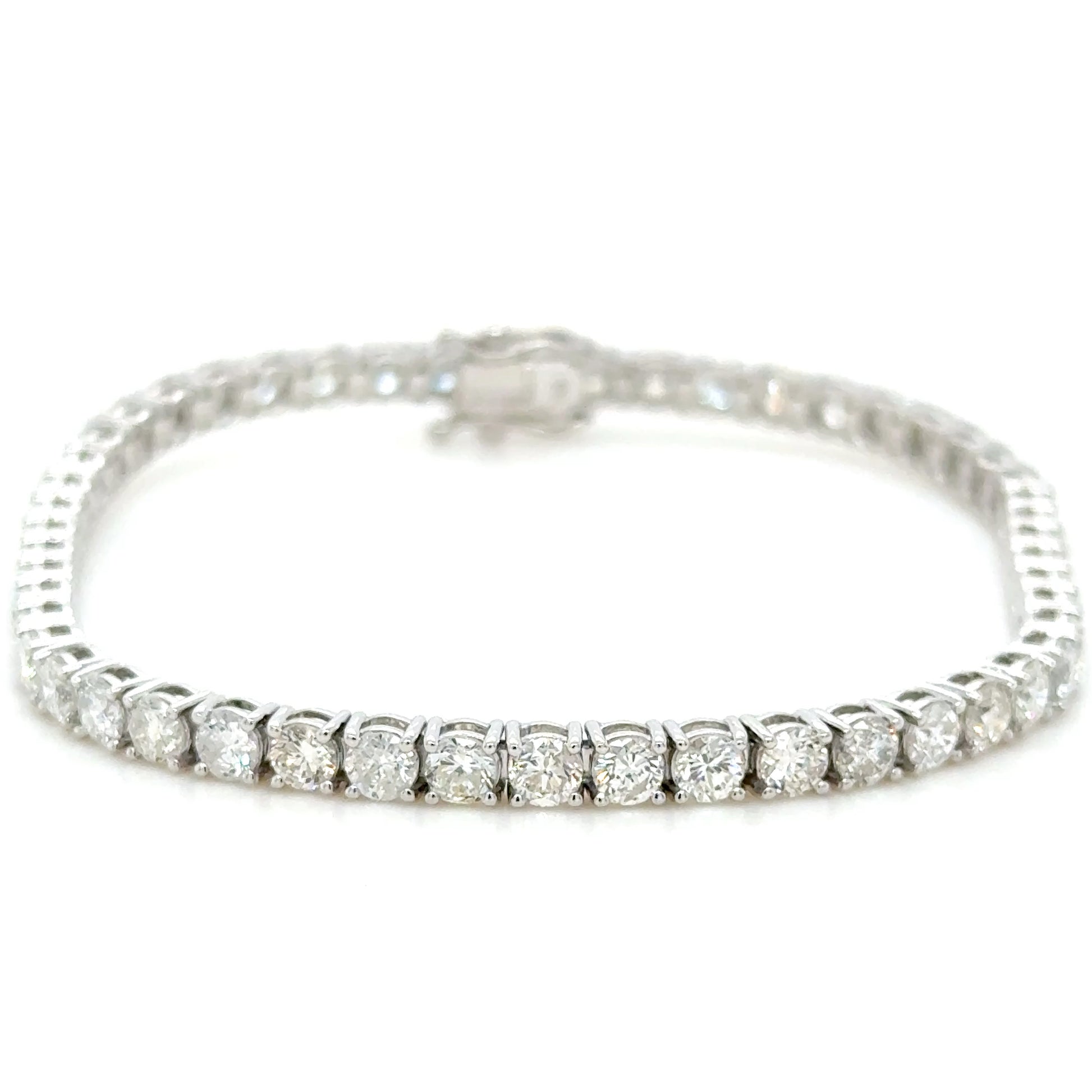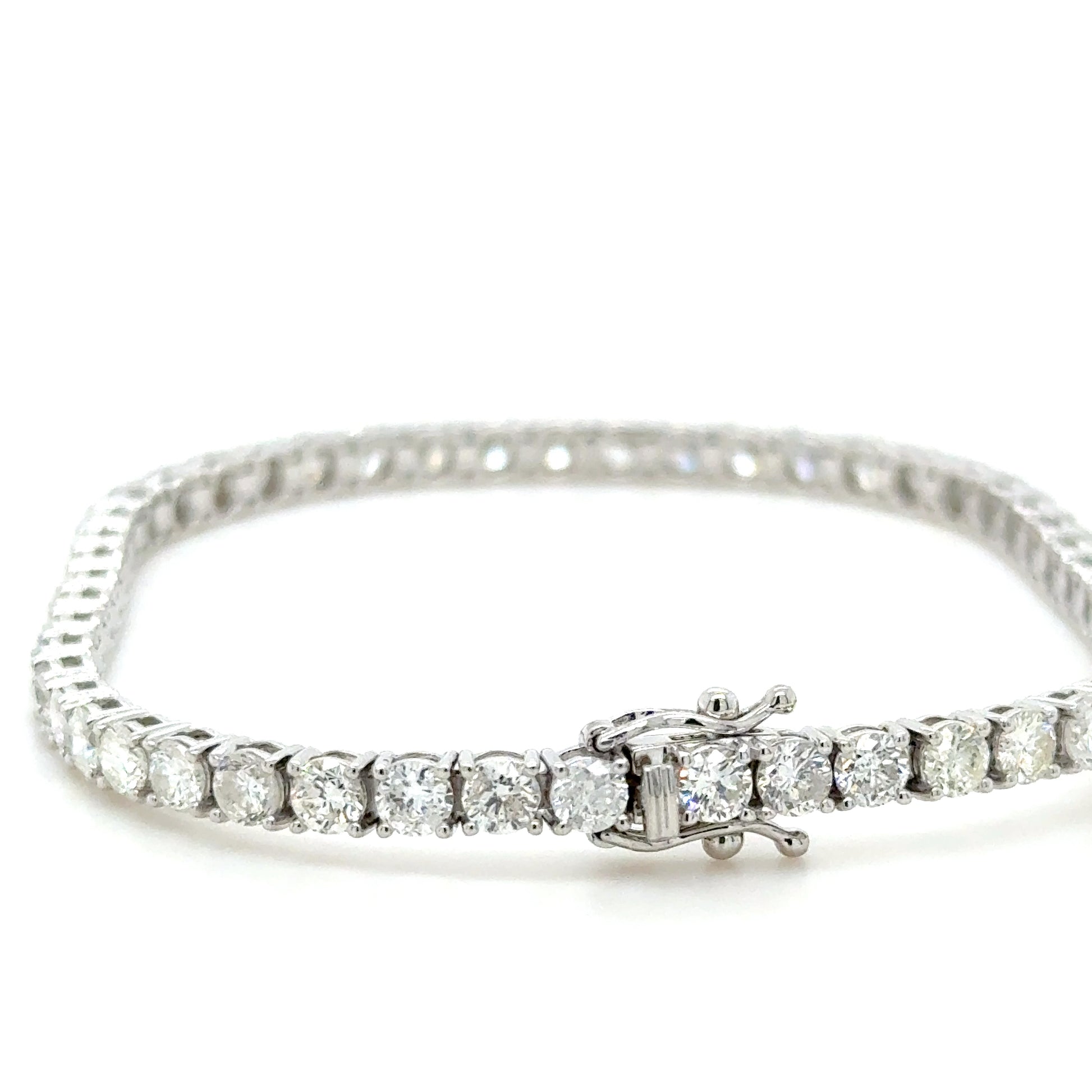 Elegantly timeless and meticulously crafted, this 6.34 carat diamond tennis bracelet is a refined expression of luxury. Each natural round-cut diamond is hand-selected for its exceptional G colour and VS1 clarity, offering a brilliant, continuous sparkle that captures the light from every angle. Set in polished 18K white gold, the bracelet features a secure clasp with an additional safety mechanism for confidence and comfort in everyday wear. Measuring 18 cm, it lays gracefully on the wrist—perfect for both special occasions and elevated daily style.