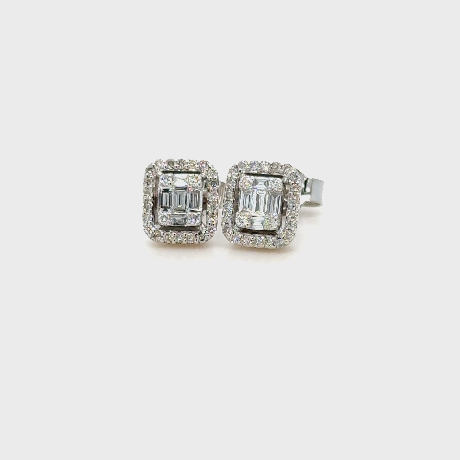 Crafted in lustrous 18K white gold, the round stones frame the baguette diamonds for enhanced sparkle and visual impact. Each earring is fitted with a secure backing, ensuring your investment remains safely in place throughout the day.