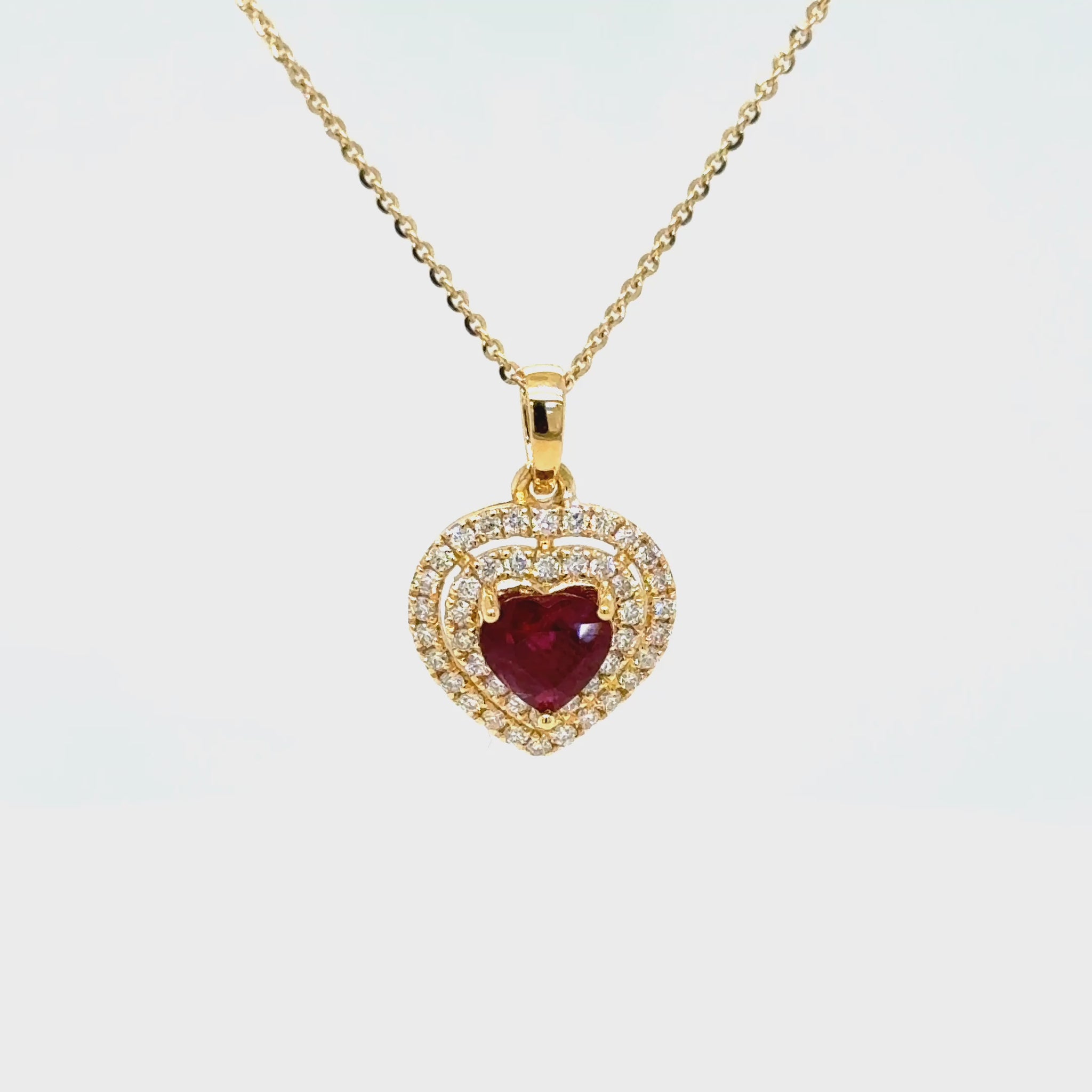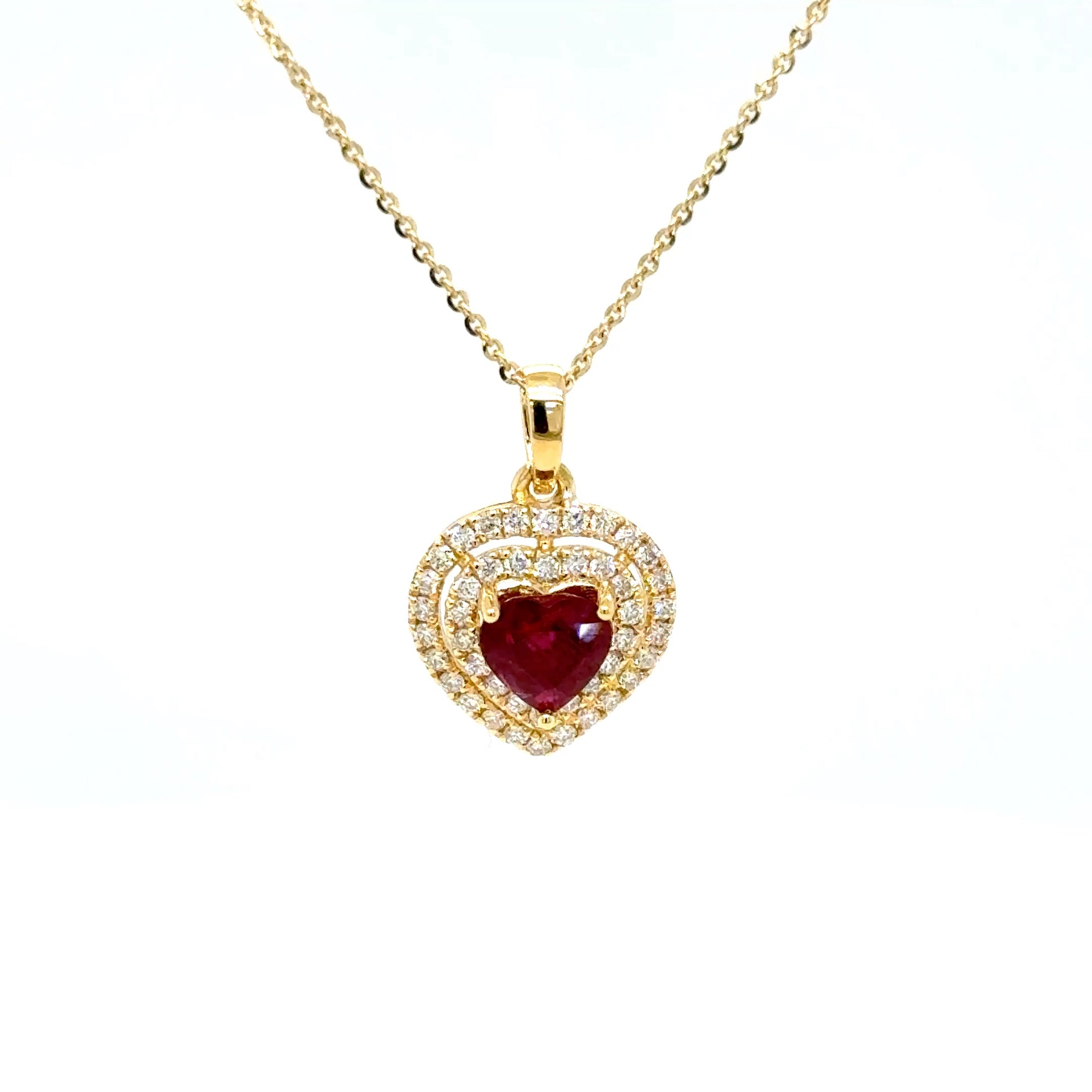 Surrounding the ruby are two graceful rows of natural diamonds, totaling approximately 0.40 carat, delicately set to enhance brilliance and add depth to the heart-shaped design. Crafted in luxurious 18K yellow gold and paired with a matching 18K yellow gold chain, this pendant offers a perfect balance of romance and refined craftsmanship. An ideal piece for meaningful gifting or as a treasured addition to a fine jewellery collection.