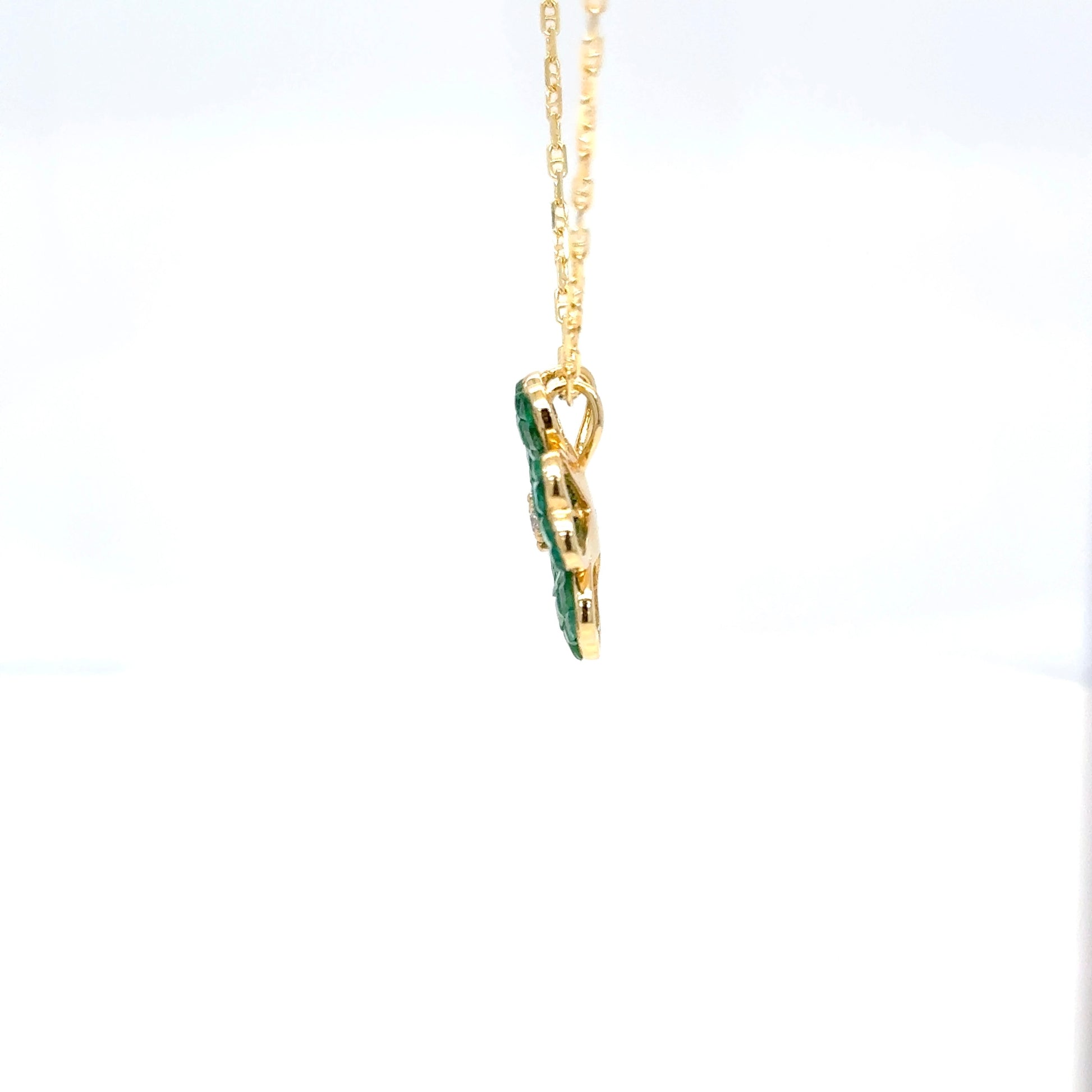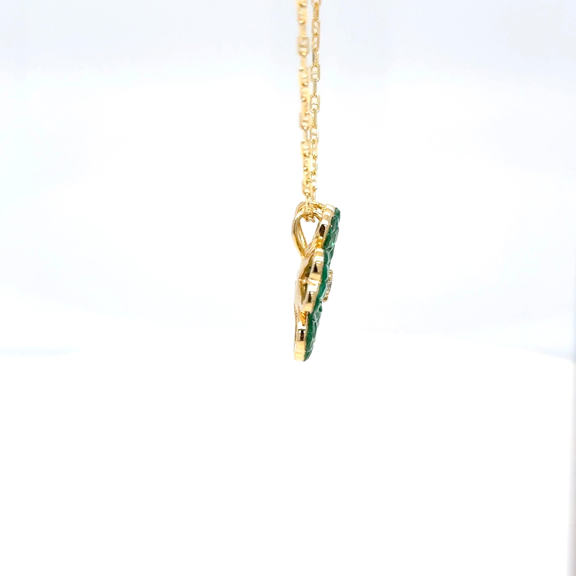 Set in 18k yellow gold, the pendant measures 1.7 cm and is suspended from a matching 45 cm fine gold chain, making it an ideal length for both everyday sophistication and special occasions. This piece is a true testament to refined artistry, with over 5 carats of natural emeralds invisibly set to achieve a seamless finish.