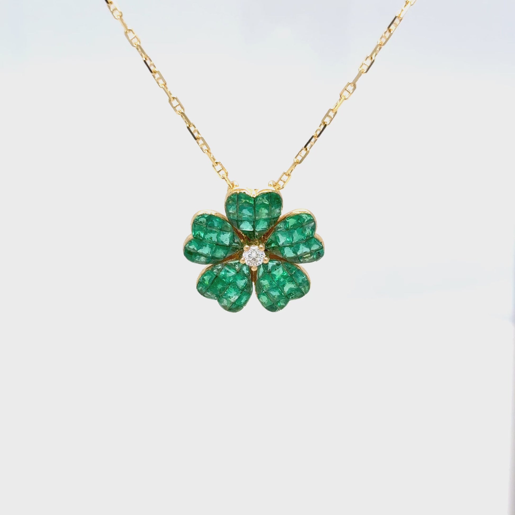 Gracefully crafted to capture the essence of nature's elegance, this beautiful emerald and diamond flower pendant necklace showcases timeless beauty and meticulous craftsmanship. Featuring invisible-set step-cut emeralds forming a delicate floral silhouette, the pendant glows with rich green hues that reflect purity, balance, and renewal. At its heart lies a natural round brilliant-cut diamond, subtly sparkling with every movement, adding a refined brilliance to the overall design.