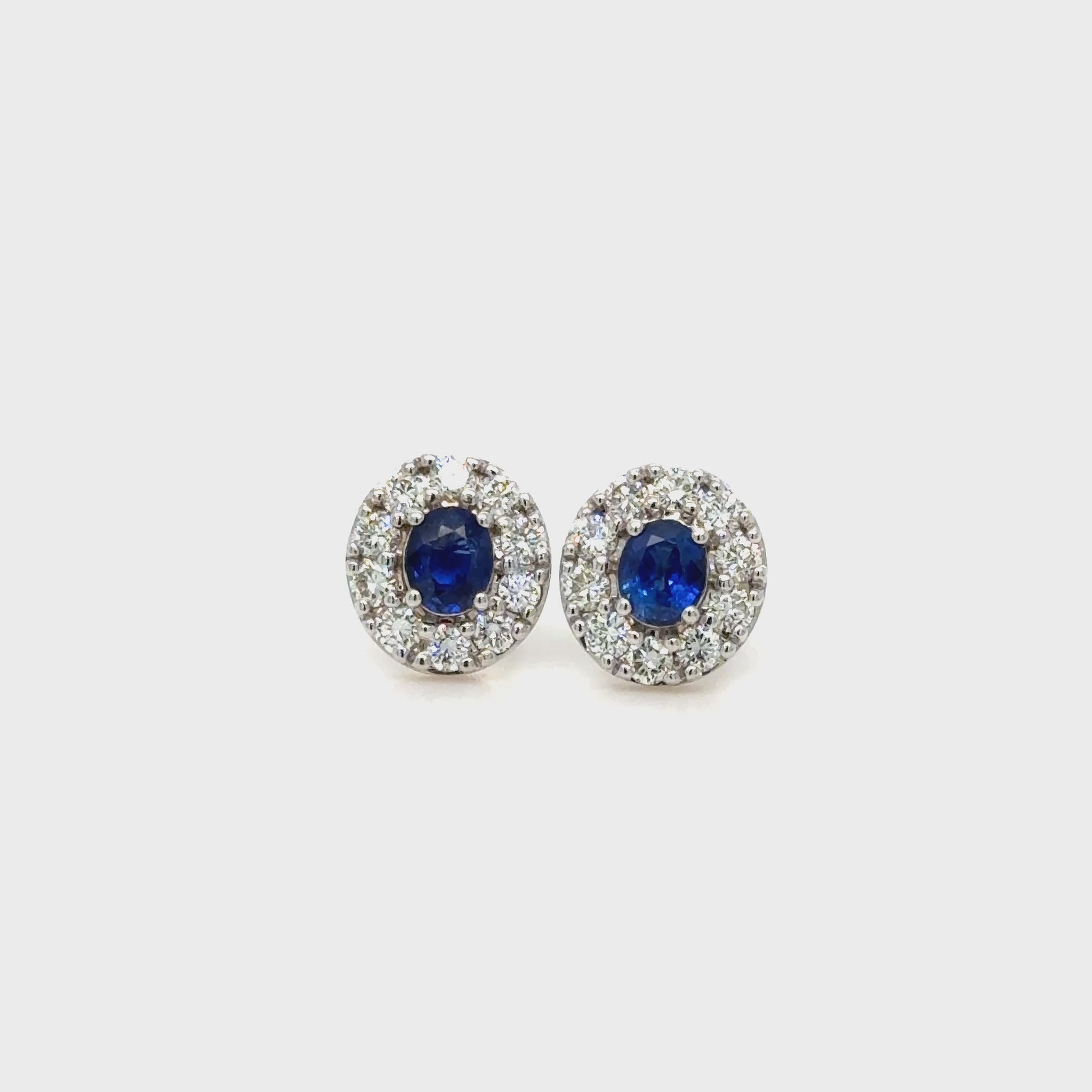 Vivid blue oval Ceylon sapphire and diamond earrings set in 18K white gold. Natural sapphires from Sri Lanka with diamond halo.