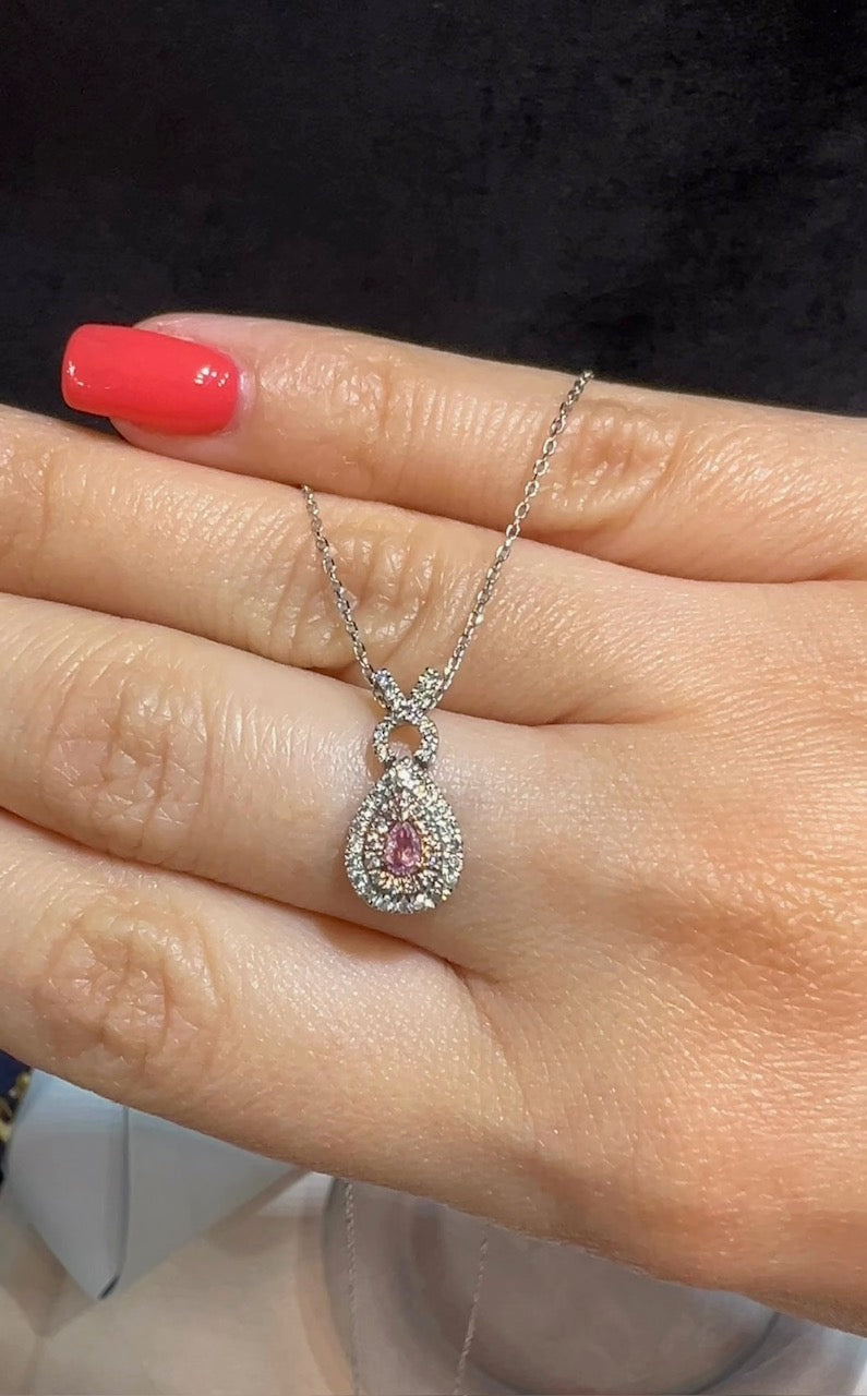 Delicate, feminine, and exquisitely detailed, this pear-shaped pendant necklace is a celebration of rare beauty. At its heart lies a natural pear-cut pink diamond, gracefully surrounded by a soft halo of round-cut pink diamonds and brilliant white diamonds. Additional white diamonds accent the design, adding layers of sparkle and sophistication. Expertly crafted in 18K white gold and suspended from a fine trace chain, this lightweight yet luxurious piece makes a romantic and timeless statement.
